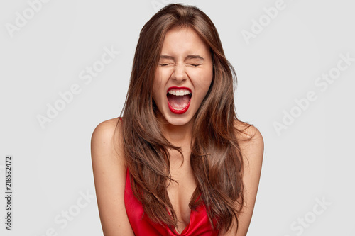 Beautiful female fashion model exclaims angrily, being emotive, has red lips, healthy pure skin, shows bare shoulders, isolated over white background. People, style, makeup, emotions concept