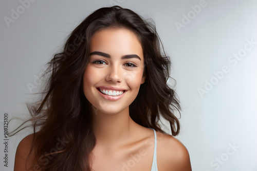 beautiful female model smiling looking into the camera on grey background, portrait of a woman