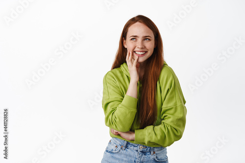 Beautiful ginger girl with pale skin and freckles, looking aside at logo and laughing happy, standing in hoodie and jeans against white background