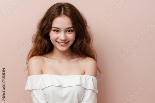 Beautiful ginger woman wearing a white off-shoulder smiling against a pastel pink background with copy space.