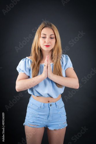 Beautiful girl doing different expressions in different sets of clothes: praying