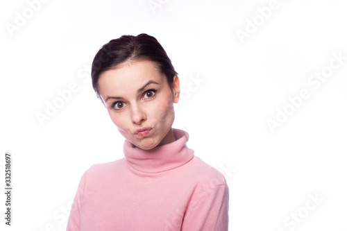 beautiful girl in a pink turtleneck talking on the phone on a white background