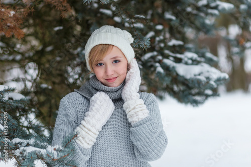 Beautiful girl in a white hat and mittens in the winter snowy fo