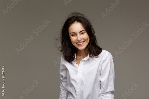 Beautiful girl in a white shirt shows emotions - smile, fun.