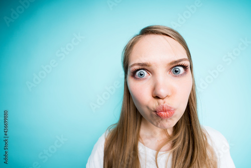Beautiful girl in a white t-shirt pouting lips and bulging eyes looking at the camera