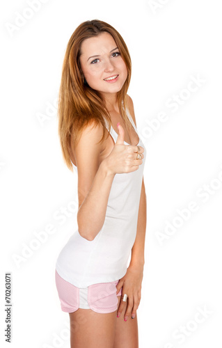 Beautiful girl lifts up the thumb