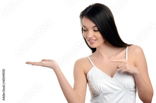 Beautiful girl pointing and showing looking away.