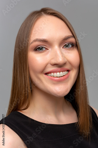 Beautiful girl smiling and surprised, white teeth with braces. Dental care. Beauty happy woman smile with orthodontic accessories. Cosmetic dentistry, orthodontics treatment.