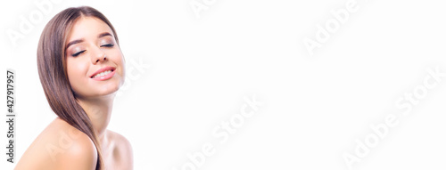 Beautiful girl with closed eyes and perfect skin, with a beautiful smile and clean white teeth.Health and beauty concept.Cosmetology, beauty and spa. Closeup portrait isolated on white background.