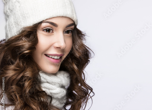 Beautiful girl with gentle makeup, curls and smile in white knit