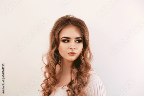 Beautiful girl with long wavy hair . Brunette with curly hairsty
