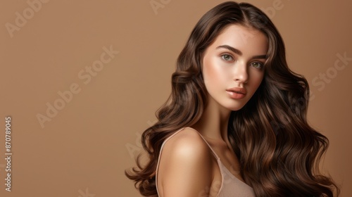 Beautiful glamorous model woman with long wavy and shiny hair against brown studio