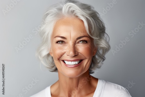 Beautiful gorgeous 50yo mid age beautiful elderly senior woman with grey hair laughing and smiling. Mature old lady close up portrait. Healthy face skin care beauty, skincare cosmetics, dental.