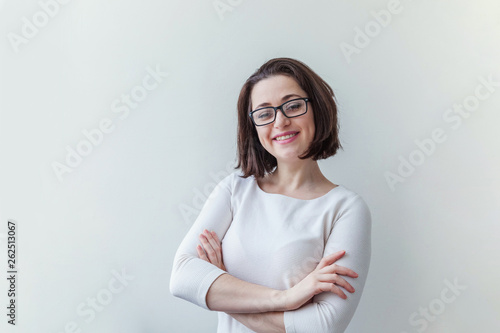 Beautiful happy girl smiling. Beauty simple portrait young smiling brunette woman in eyeglasses isolated on white background. Positive human emotion facial expression body language. Copy space