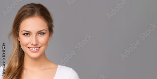 Beautiful healthy young caucasian woman smiling and looking at camera, perfect teeth, grey banner background with copy space. Generative AI model
