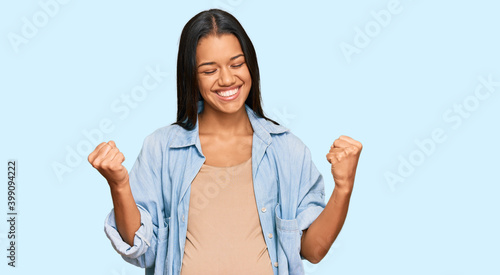 Beautiful hispanic woman expecting a baby showing pregnant belly very happy and excited doing winner gesture with arms raised, smiling and screaming for success. celebration concept.
