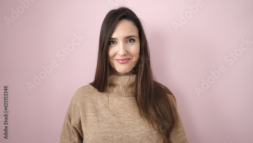 Beautiful hispanic woman smiling confident standing over isolated pink background