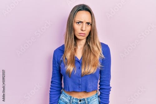 Beautiful hispanic woman wearing casual blue shirt skeptic and nervous, frowning upset because of problem. negative person.