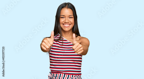 Beautiful hispanic woman wearing casual clothes approving doing positive gesture with hand, thumbs up smiling and happy for success. winner gesture.