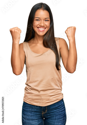 Beautiful hispanic woman wearing casual clothes celebrating surprised and amazed for success with arms raised and open eyes. winner concept.