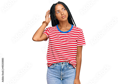 Beautiful hispanic woman wearing casual clothes confuse and wondering about question. uncertain with doubt, thinking with hand on head. pensive concept.