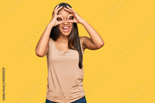 Beautiful hispanic woman wearing casual clothes doing ok gesture like binoculars sticking tongue out, eyes looking through fingers. crazy expression.