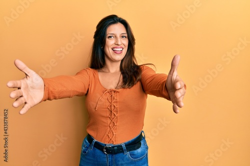 Beautiful hispanic woman wearing casual clothes looking at the camera smiling with open arms for hug. cheerful expression embracing happiness.