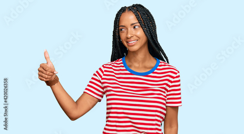Beautiful hispanic woman wearing casual clothes looking proud, smiling doing thumbs up gesture to the side
