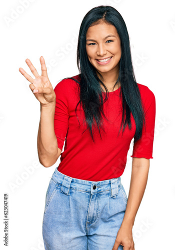 Beautiful hispanic woman wearing casual clothes showing and pointing up with fingers number three while smiling confident and happy.