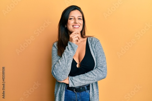 Beautiful hispanic woman wearing casual clothes smiling looking confident at the camera with crossed arms and hand on chin. thinking positive.