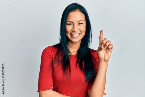Beautiful hispanic woman wearing casual clothes smiling with an idea or question pointing finger up with happy face, number one