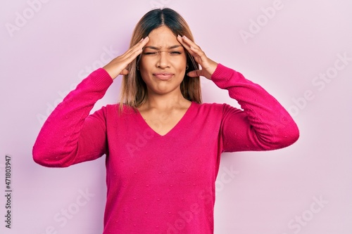 Beautiful hispanic woman wearing casual pink sweater with hand on head, headache because stress. suffering migraine.