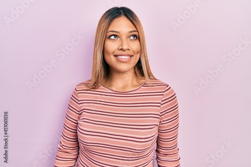 Beautiful hispanic woman wearing casual striped sweater looking away to side with smile on face, natural expression. laughing confident.