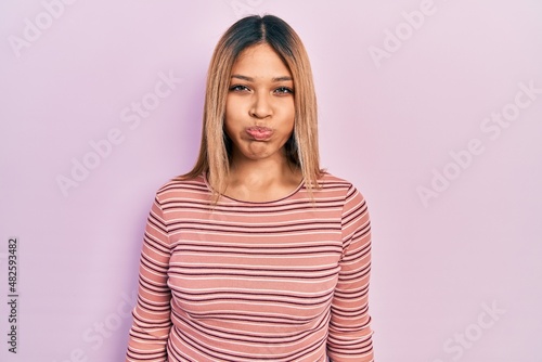 Beautiful hispanic woman wearing casual striped sweater puffing cheeks with funny face. mouth inflated with air, crazy expression.