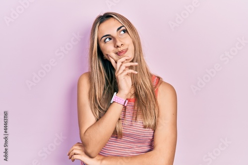 Beautiful hispanic woman wearing casual summer t shirt with hand on chin thinking about question, pensive expression. smiling and thoughtful face. doubt concept.