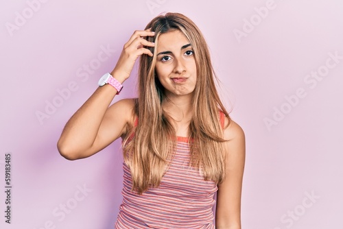 Beautiful hispanic woman wearing casual summer t shirt worried and stressed about a problem with hand on forehead, nervous and anxious for crisis