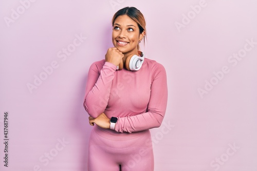 Beautiful hispanic woman wearing gym clothes and using headphones with hand on chin thinking about question, pensive expression. smiling and thoughtful face. doubt concept.
