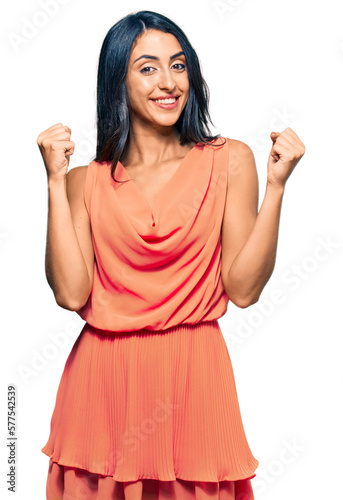 Beautiful hispanic woman wearing summer dress screaming proud, celebrating victory and success very excited with raised arms