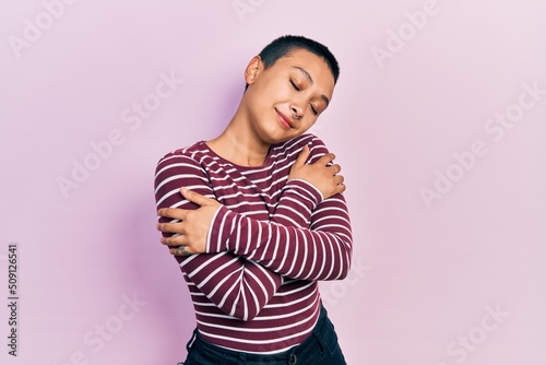 Beautiful hispanic woman with short hair wearing casual striped sweater hugging oneself happy and positive, smiling confident. self love and self care