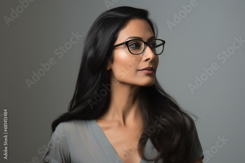 Beautiful indan woman in eyeglasses looking away isolated on grey.