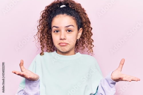 Beautiful kid girl with curly hair wearing casual clothes clueless and confused expression with arms and hands raised. doubt concept.