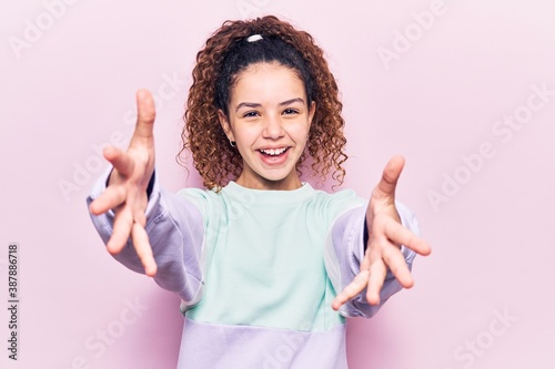 Beautiful kid girl with curly hair wearing casual sporty clothes looking at the camera smiling with open arms for hug. cheerful expression embracing happiness.