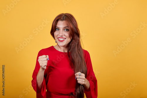 Beautiful lady with long dark hair over isolated orange wall celebrating a victory in winner position. Lovely girl in red clothes holding her hands up at chest level and looks so happy .