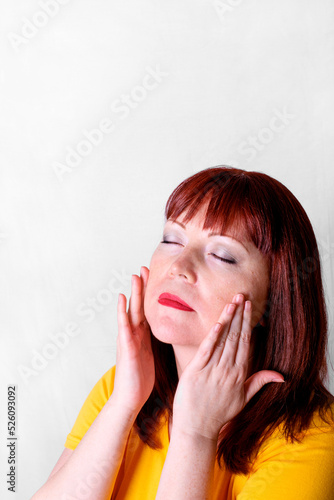 Beautiful mature adult red-haired woman applying face cream with eyes closed. Skincare routine. Doing face massage. Copy space