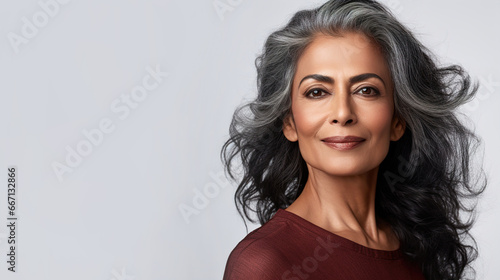 Beautiful mature well-groomed Indian woman on a gray background with copyspace
