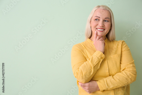 Beautiful mature woman on color background