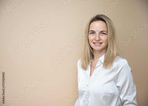 beautiful mid age business woman posing in front of brown background