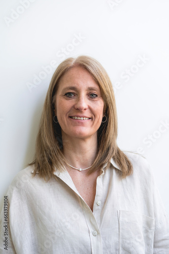 Beautiful mid aged woman looking at camera leaning on white wall.