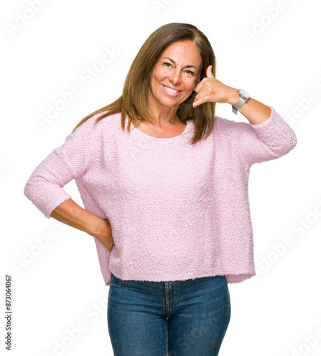 Beautiful middle age adult woman wearing winter sweater over isolated background smiling doing phone gesture with hand and fingers like talking on the telephone. Communicating concepts.