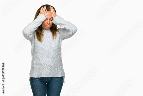 Beautiful middle age adult woman wearing winter sweater over isolated background suffering from headache desperate and stressed because pain and migraine. Hands on head.
